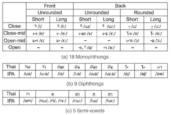 Thirty-two vowels in Thai: (a) 18 monophthongs, (b) 9 diphthongs, and (c) 5 semi-vowels.