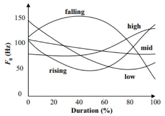 There are five lexical tones in Thai as follows: mid/M/, low/L/, high/H/, falling/F/, and rising/R/. The identification of tone relies on the shape of the fundamental frequency (F0) contour (Figure 2) [10]. A change in the tone will change the meaning of a word. For example, khaa has five meanings according to the effect of the tone (Table 2).