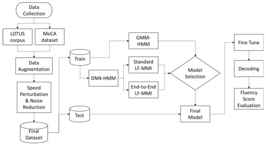 In this section, we proposed the end-to-end ASR model with a special decoding algorithm to support the language fluency score. The overall experiment methodology and data processing flow are depicted in Figure 3.