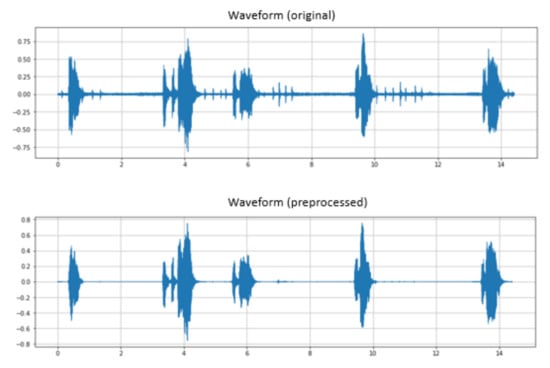 To improve the data quality, we implemented preprocessing steps for the original speech data by applying a recurrent neural network noise suppression algorithm (RNNoise) [22] to remove the background noise from all utterances with an additional spectral gating filter to eliminate digital pencil sounds and generate clean speech data (Figure 5).