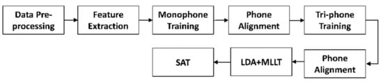 Since Thai is a tonal language, we extracted MFCC together with pitch features to help improve the system’s overall performance [26]. After these features were extracted, we then transformed MFCC and pitch features with cepstral mean and variance normalization following the training sequence shown in Figure 6.