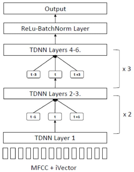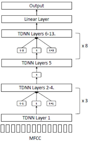 The architecture of the LF-MMI model comprises five TDNN layers with splicing indexes as (−1,0,1) (−1,0,1) (−3,0,3) (−3,0,3) (−3,0,3), as shown in Figure 8; (−1,0,1) means that the TDNN layer will process the input vectors at time t − 1, t, and t + 1, and (−3,0,3) means the TDNN layer will process input vectors at time t − 3, t, and t + 3.