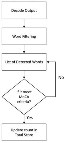 As output word sequences might contain ineligible words because of recognition process errors as well as unintended spoken words from patients, we implemented additional steps to filter words that begin with the initial phoneme/k/corresponding to “ก” in Thai before feeding them into the scoring algorithm. The steps for decoding and scoring are illustrated in Figure 11.