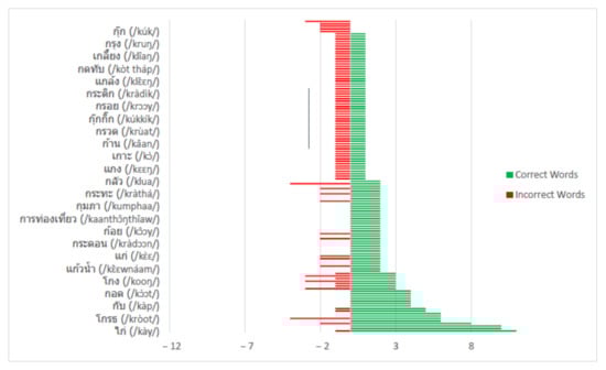 The measurement of ASR accuracy relies on the actions of the recognizer during the decoding process. Invalid word detection is counted as a substitution error, undetected words are counted as a deletion error, and extra words generated by the decoder cause an insertion error. The detection results are reported in Table 10. The total number of incorrect words was a summation of the substitution, insertion, and deletion errors. Figure 13 highlights a summary of the total count of correct words versus incorrect words detected in our model.