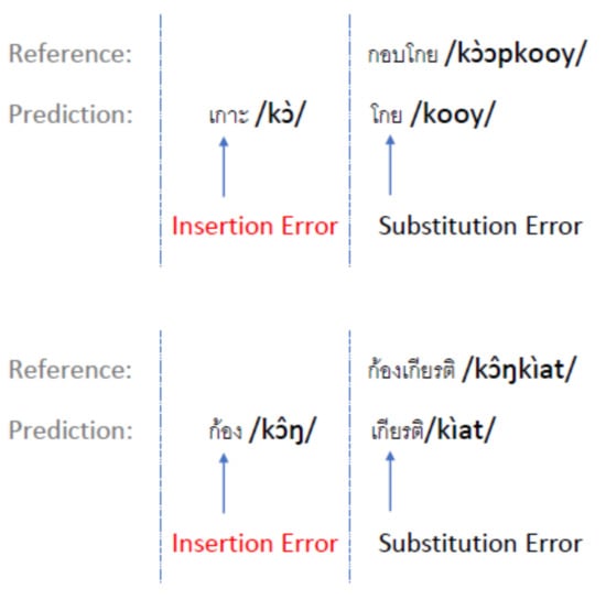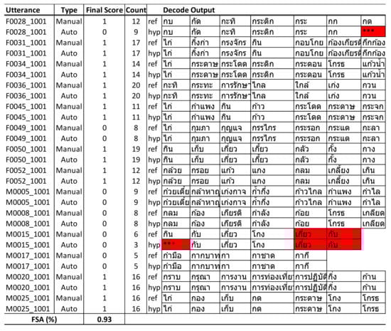We compared the results of automated scoring with manual scoring and found that for utterances with substitution errors, the ASR recognizer attempted to predict the closest words where the initial phone started with “ก” (/k/) that were still within the dictionary. For example, the word “กราบ” (/kràap/) was incorrectly detected as “กระดาษ” (/kràdàat/); however, because of “กระดาษ”—also a valid Thai word starting with “ก” (which fully met the assessment criteria)—the scoring algorithm would count this word as eligible and result in no big deviation from the total count of words, although several of them were detected incorrectly but with no impact to the overall score for that utterance. Utterances with deletion errors would cause some words to be skipped and had a direct impact on the total word count and the overall score. However, because our ASR model had a low percentage of deletion errors in the test utterances, it had less of a negative impact on the final score.