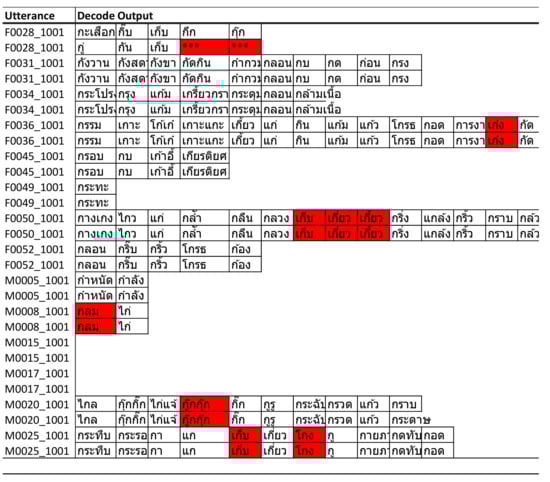 We analyzed the results of the decoding output from our model for each speaker to determine the source of the errors. Substitution error was the main contributor, with an average of 24.18%; 0.82% of the problem originated from insertion and 5.77% from deletion errors, while the percentage of words that could be detected correctly was in the range of 70.05% (Table 8).