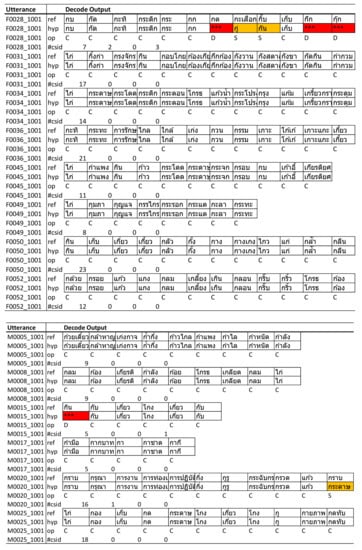 One approach to avoid new training steps whenever new words are added into the dictionary is the phoneme recognition approach. To this end, Theera-Umpon et al. [20] proposed a new method to classify the tonal accents of syllables using soft phoneme segmentation techniques for Thai speech, which was better than the hard-threshold approach for phoneme classification. Hu et al. [21] conducted an experiment with Mandarin and Thai words by incorporating tonal information from fundamental frequency (F0) and fundamental frequency variation into the convolution neural network (CNN) architecture and compared CNN with DNN. The WER for Thai was 33.19% and 35.16% for CNN and DNN.