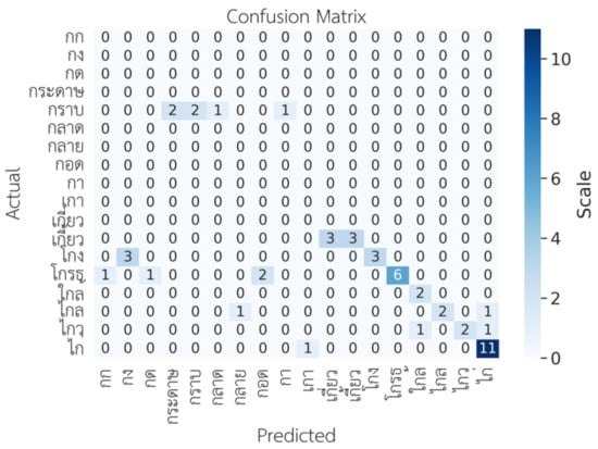 Further analysis showed that the model could not accurately predict words with similar tones; for example, ไกล/klay/vs. ใกล้/klây/, ไกล/klay/vs. ไก่/kày/, เกี้ยว/kîaw/vs. เกี่ยว/kìaw, as shown in Figure 16.