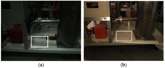 In general, the illumination conditions of the overall environment can be enhanced through a flash light, but visual characteristics of the leakage would still tend to appear as colorless, as shown in the white box mark in Figure 3a. The use of additional LED lights could enhance the water leakage edge features visualization, but the overall edge contour would look still fuzzy and hard to detect (as shown in Figure 3b).