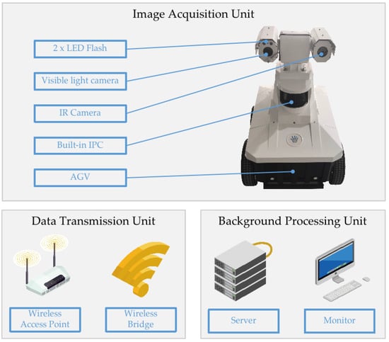 The image acquisition unit is composed of an automatic guided vehicle AGV (738 × 864 × 592 mm), visible light camera, two flash lights, an infrared camera, and an industrial personal computer (IPC). The visible light camera and infrared camera can capture high-definition images in two different light spectra at the same time []. In order to solve the problems of uneven light in the industrial environment and the consequent difficulty in identifying the features of colorless effusion, a pair of flash lights is designed for the image acquisition unit to expose the contour of different shapes of effusions more clearly.