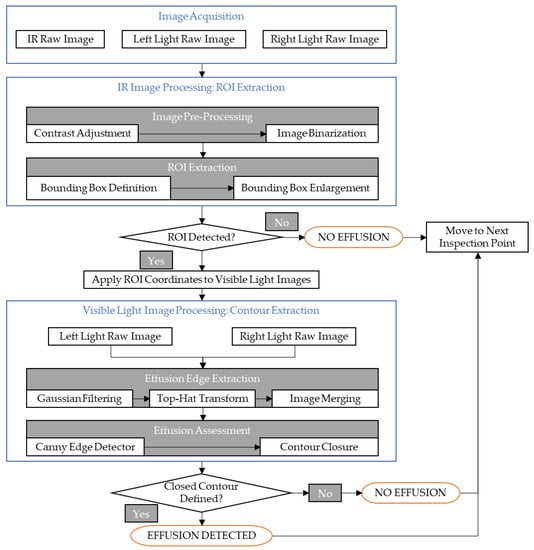 To overcome this issue, this paper combines the infrared imaging with visible light imaging. In this context, an infrared image is used to capture the potential effusion area. Subsequently, two visible light images are used to verify and assess the actual presence of the leakage/effusion as a classification task.