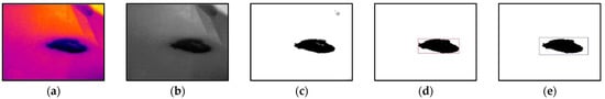 IR image processing procedure: (a) raw IR image in false colors, (b) infrared grayscale image, (c) enhanced contrast image, (d) bounding box, and (e) enlarged bounding box.