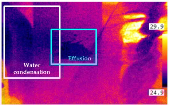 Although a colorless effusion has a lower temperature compared to the environment, the recognition of fluid accumulation within an infrared image could be potentially affected by water condensation phenomena on pipes, equipment, and floor. Figure 7 shows how, in a humid environment, water condensation and actual effusion could partially overlap, increasing the complexity of the classification task. This scenario indicates that, in the presence of humid environments, relying on the sole use of infrared imaging would produce a high false positive rate [].