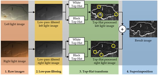In this phase, the visible light raw images (Figure 9, step 1) are subject to a Wiener low-pass filtering [] with a 5 × 5 pixel neighborhood size, with the aim of reducing the ambient noise. After filtering (as shown in Figure 9, step 2), the effusion contour presents a dark edge on the top (farther from the light source) and a bright edge on the bottom (closer to the light source). The effusion contour extraction is then carried out by applying a top-hat transform []. Specifically, a black top-hat and white top-hat transforms [] were both applied to the input images and highlight the effusion contour.