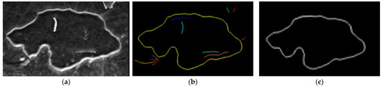 (5) According to the above four steps, pixels classified as strong edges are identified as edges, and then weak edge pixels need to be further confirmed. In this respect, the weak edge pixels connections are explored within an eight-neighborhood space. If in such neighborhood there is at least a strong edge pixel, the weak edge point can be confirmed as a real edge. In this way, it is possible to completely map the effusion edges, as shown in Figure 10. In Figure 10b, the identified edges are represented in different colors. Specifically, the yellow line represents the contour features of the effusion, while the other colored lines are just noise which is then removed (as shown in Figure 10c).
