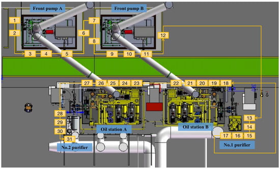 With reference to Figure 11, the overall power plant floor is divided into six inspection areas based on the working equipment location: Area 1 (front pump A); Area 2 (front pump B); Area 3 (No.2 purifier device); Area 4 (oil station A); Area 5 (oil station B); and Area 6 (No.1 purifier device). Each inspection area includes a number of inspection points (i.e., critical points for equipment maintenance). There are 31 total inspection points distributed in 6 inspection areas. In this context, the AGV moves along a predefined inspection path covering the 31 inspection points, as illustrated in Figure 11. To each inspection point corresponds a specific AGV positioning location which is designed to provide for a clear view of the inspection point, minimizing the cluttering and shading.