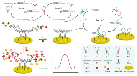 - Huang, X.; Niu, W.; Wu, J.; Wang, Y.; Li, C.; Qiu, j.; Xue, J. A triple-amplification differential pulse voltammetry for sensitive detection of DNA based on exonuclease III, strand displacement reaction and terminal deoxynucleotidyl transferase. Biosens. Bioelectron. 2019, 143, 111609. [Google Scholar] [CrossRef] [PubMed]