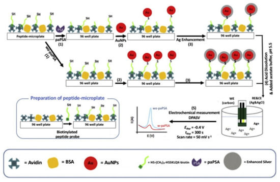 - Parnsubsakul, A.; Safitri, R.E.; Rijiravanich, P.; Surareungchai, W. Electrochemical assay of proteolytically active prostate specific antigen based on anodic stripping voltammetry of silver enhanced gold nanoparticle labels. J. Electroanal. Chem. 2017, 785, 125–130. [Google Scholar] [CrossRef]
