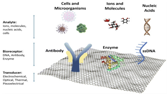 - Peña-Bahamonde, J.; Nguyen, H.N.; Fanourakis, S.K.; Rodrigues, D.F. Recent advances in graphene-based biosensor technology with applications in life sciences. J. Nanobiotechnol. 2018, 16, 1–17. [Google Scholar] [CrossRef]