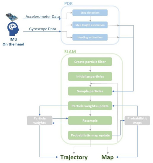Overview of the HeadSLAM method. The Simultaneous Localisation And Mapping (SLAM) step is performed after the Pedestrian Dead Reckoning (PDR) in order to create a map based on the data collected from head-mounted inertial measurement units. The grey arrows show the sequence of the flowchart. The dark blue arrows represents the data or the variables’ usage or update.