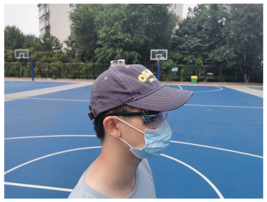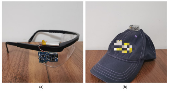 The sensor adopted in the experiments was the SensorTile Microcontroller Unit (MCU) module (STEVAL-STLCS01V1) from STMicroelectronics (Geneva, Switzerland), which includes a low-power 3D accelerometer and 3D gyroscope (LSM6DSM), an ultra-low-power 3D magnetometer (LSM303AGR), a Bluetooth low energy network processor (BlueNRG-MS), a 32 bit ultra-low-power MCU with Cortex®M4F (STM32L476JG), and a 100 mAh lithium-ion polymer battery. Data were collected at 20 Hz and transferred to a mobile phone by Bluetooth. Two modules were used for each sessions with different placements. One was firmly attached to a pair of glasses, whilst the other was connected to a cap. The placement is shown in Figure 2 and Figure 3.