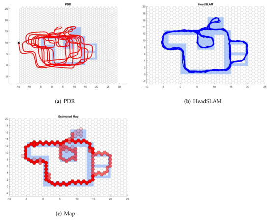 Indoor test results’ example. The light blue shape is the passable area extracted from the floor plan and acts as a reference for the outcomes generated by the PDR and HeadSLAM. Red lines in (a) represent the trajectory estimated by the PDR method. Blue lines in (b) show the trajectory of the particle with the highest weight in SLAM. Red hexagons in (c) represent the trajectory map generated by HeadSLAM, with darker shades representing those with a higher visiting frequency.