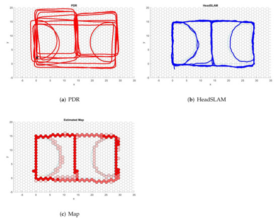 Outdoor test results’ example. Participants were asked to walk the outline of a basketball court. Red lines in (a) represent the trajectory estimated by the PDR method. Blue lines in (b) show the trajectory of the particle with the highest weight in SLAM. Red hexagons in (c) represent the trajectory map generated by HeadSLAM, with darker shades representing those with a higher visiting frequency.