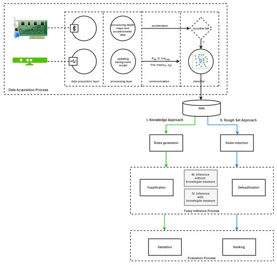 The main goal of this research was to compare two approaches to posture recognition in fall detection: I. Knowledge Approach and II. Rough Set Approach. In the first approach a method based on a domain knowledge was used to generate a set of rules, the cardinality of which results from the combinatorial characteristic of this method. In turn, in the second approach induction method based on rough sets (described in Section 3.3) was used to reduce a set of rules. Next, both sets of rules were used in the fuzzy inference and evaluation process separately. Additionally, expert knowledge was used for modeling the selection of the parameters for the fuzzification function (described in Section 4). This combination of fuzzy and rough solutions is a novelty to the systems studied in the literature on fall detection problems. The concept of a hybrid approach (that we call a FuzzyRoughSystem, or FRSystem), presented in Figure 1, was based on three processes: Data Acquisition Process, Fuzzy Inference Process and Evaluation Process.