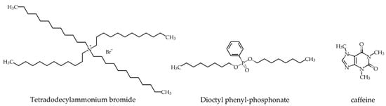 Molecular formulae of tetradodecylammonium bromide (TDAB), dioctyl phenyl-phosphonate (DOPP), and caffeine.