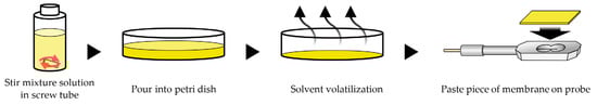 The lipid/polymer membrane was formed by mixing 10 mL of 0.3, 1, or 3 mM TDAB in THF as a lipid, 1.5 mL DOPP as a plasticizer, and 800 mg PVC as a support agent. The mixture solution was poured into a Petri dish (90 mm φ), and the membrane was formed by volatilizing the THF, and then a piece of the membrane was pasted on a probe (Figure 2).