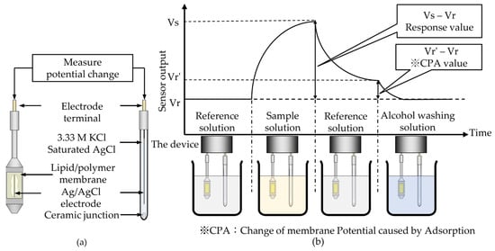 All measurements in this study were based on the commercialized TS–5000Z taste sensing system (Intelligent Sensor Technology, Inc., Kanagawa, Japan). The detection unit of the taste sensor is a device that can be equipped with a reference electrode and up to eight sensor electrodes. As shown in Figure 3a, the structure of this sensor electrode consisted of a probe with a hole, whose surface can adhere to a lipid/polymer membrane. The inside of the sensor electrode was filled with 200 μL of saturated AgCl/3.33 M KCl solution. For the reference electrode, an Ag/AgCl-saturated KCl reference electrode was used. The change in membrane potential between the reference and sensor electrodes was used as the sensor output.