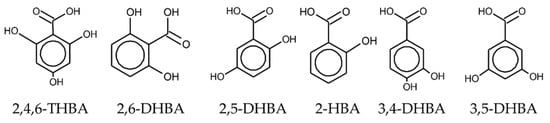 In the second place, Figure 5 and Table 3 together indicate that, at the same pKa level (such as 2,6–DHBA and 2,4,6–THBA; 2,5–DHBA and 2–HBA), an HBA with a larger log P resulted in a smaller Vr. For example, the log P of 2,6–DHBA is 2.24, which is higher than that of 2,4,6–THBA (1.80). When they were used to modify the 3 mM TDAB membranes respectively, the Vr of the 2,6–DHBA-modified membrane was 53.36 mV, which was smaller than the Vr of the 2,4,6–THBA-modified membranes (=107.70 mV). Similarly, the log P of 2–HBA (=2.06) was higher than the log P of 2,5–DHBA (=1.56), and the Vr of the 2–HBA-modified membrane (42.71 mV) was smaller than that of the 2,5–DHBA-modified membrane (93.56 mV). These results can be interpreted in terms of the hydrophobicity of the HBAs: an HBA with a higher hydrophobicity is more likely to adsorb on the lipid/polymer membrane, resulting in a smaller reference potential.