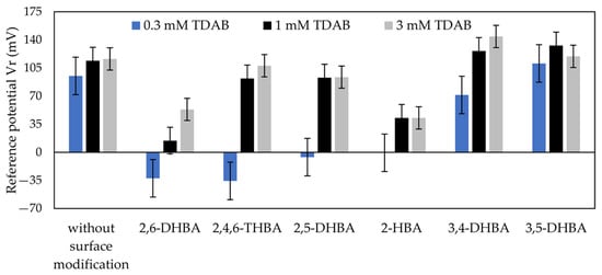 Comparing the results obtained with and without surface modification using various HBAs, the effects of HBAs on the reference potential were evaluated. Firstly, from Figure 5, the results indicate that the reference potential varied with the surface modification of HBAs. The ionization of HBAs can be used to interpret this phenomenon. The ionized HBAs were adsorbed to the lipid/polymer membrane through the electrostatic and hydrophobic interactions, and then they neutralized the positive charge of the lipid TDAB, causing the surface charge density of the membrane to decrease, resulting in the Vr being smaller than that obtained without surface modification.