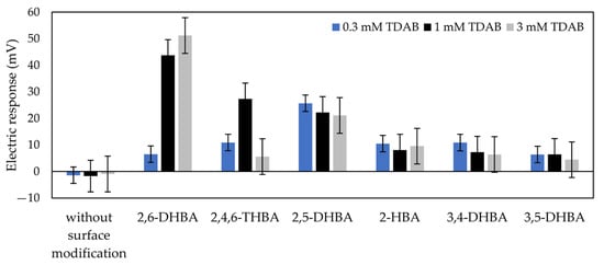 Figure 6 shows the response to 100 mM caffeine measured by the taste sensor with the lipid/polymer membrane modified with six types of HBA, where the concentration of HBAs in all modification solutions was 0.1 wt%. The response to caffeine increased after surface modification with the HBAs. In particular, the membranes modified with 2,6–DHBA showed the greatest response to caffeine. A moderate response appeared in the membranes modified with 2,4,6–THBA, 2–HBA, and 2,5–DHBA. The smallest response was obtained for the membranes modified with 3,4–DHBA and 3,5–DHBA.