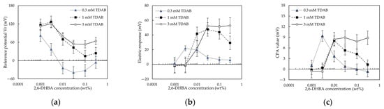 2,6–DHBA-concentration-effect curves, for 100 mM caffeine, obtained using the taste sensor with the lipid/polymer membrane (0.3, 1, 3 mM TDAB): (a) change in reference potential; (b) change in electric response; and (c) change in CPA value. The error bar expresses the SD, of the data, of n = 4 (electrode) × 4 (rotation) = 16 values.