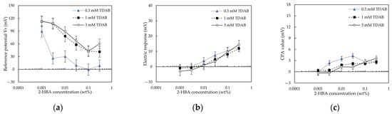 The 2–HBA-concentration-effect curves for 100 mM caffeine obtained using the taste sensor with the lipid/polymer membrane (0.3, 1, and 3 mM TDAB): (a) change in reference potential; (b) change in electric response; and (c) change in CPA value.