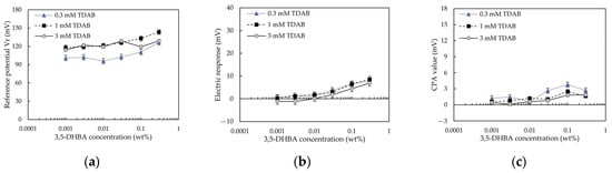 The 3,5–DHBA-concentration-effect curves for 100 mM caffeine, using the taste sensor with lipid/polymer membrane (0.3, 1, and 3 mM TDAB): (a) change in reference potential; (b) change in electric response; and (c) change in CPA value.