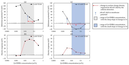 Moreover, for the 2,6–DHBA-modified membrane with 0.3 mM TDAB, at a high 2,6–DHBA concentration, the response to caffeine was low. We considered that this was related to the slope of the change in Vr. As shown in the blue area of Figure 10c, the slope of the change in Vr with increasing 2,6–DHBA concentration was small, indicating the difficulty in changing Vr, resulting in an inadequate response to caffeine. For example, as shown by the red arrow B in Figure 10c, inducing a 40-mV shift in Vr required a dramatic change in the surface charge density of the membrane. However, this is impossible because of the lesser adsorption of caffeine (the CPA value for the 0.3 wt% 2,6–DHBA modified membrane with 0.3 mM TDAB = −0.03 mV). Therefore, an inadequate response to caffeine was obtained.