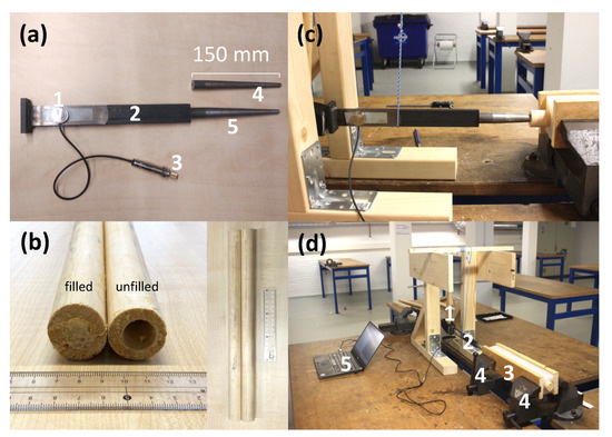 (a) The simplified implant model consisting of a contact microphone 1, broach handle 2, a 6.3 mm jack to the computer 3, smaller broach 4 and a larger broach 5. (b) Example of filled and unfilled bone model. Experiment setup (c) side view and overview (d) showing the swing hammer 1, hammer and broach model with the attached microphone 2, bone in silicone frame 3 clamped between two vices 4 and the computer to record and process the data 5.