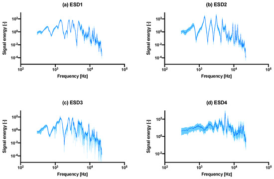 The analyzed ESD plots shown in Figure 3 compare the in vitro bench top setup (a–c) versus an in situ cadaver study (d). The main observable peaks appeared to be consistent with each other, in terms of locations, although the peak energy heights of the non-fixated samples (b) are much greater than the well fixated group. In terms of determining fracture of the bone (c), it is difficult to determine (if at all), whether a fracture is present in the bone.