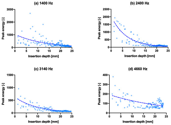 (a–d) are the isolated peak energies of each hammer blow, plotted as peak energy vs. insertion depth (fractured bone model condition) for the four main peak frequencies at 1400 Hz, 2400 Hz, 3140 Hz and 4660 Hz, respectively, with exponential trend lines. The same graphs with hammer blows on the x-axis are shown in Supplementary Materials Figure S5.