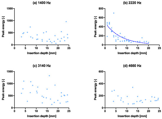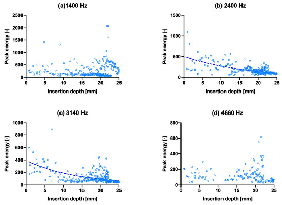 Capability of predicting insertion depth with frequencies by peak energy vs. insertion depth through the course of inserting the broach into the bone. (a–d) are the isolated peak energies (larger broach condition) for the four main peak frequencies at 1400 Hz, 2400 Hz, 3140 Hz and 4660 Hz, respectively, with exponential trend lines. The same graphs with hammer blows on the x-axis are shown in Supplementary Materials Figure S3.