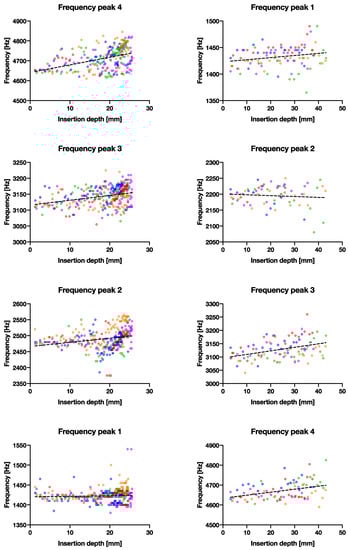 The correlation between recorded frequency vs. broach insertion depth with linear trend lines. Left column shows the larger broach with good fixation and right column shows the smaller broach with poor fixation. Each row represents the four main frequency peaks observed.