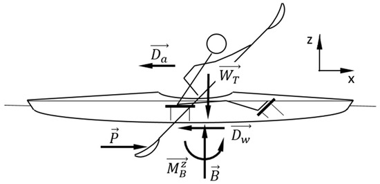 To improve the kayaker’s performance, it is essential to understand the mechanics of interaction forces between the kayaker, paddle, kayak, and water. To assess the efficiency of the paddling movement, it is vital to quantify all the actions (forces and moments) that the kayaker exerts during this process. Figure 1 shows all the actions on these three bodies, where is the total weight of the three bodies; , paddle propulsion force; , water drag force; , air drag force; , buoyant force; , moment caused by water distributed on the hull. Considering their small magnitude, and were neglected.
