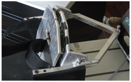The foot rest/strap was custom-designed and built at the ISEP/IPP, School of Engineering. This foot rest/strap (Figure 3) has a structure similar to the shape of the original foot rest and is divided into two parts, each one having four double strain gauge load cells (Figure 4), allowing measurement of the left and right forces independently. These load cells work in both directions, measuring push and pull forces (compression and tension forces, respectively). The position of the four load cells on each side was chosen so they would work similarly to the supports of a scale. The load cells are connected in a full Wheatstone bridge with 8 active strain gauges, resulting in an instrumented foot rest that is insensible to the location of the applied force.