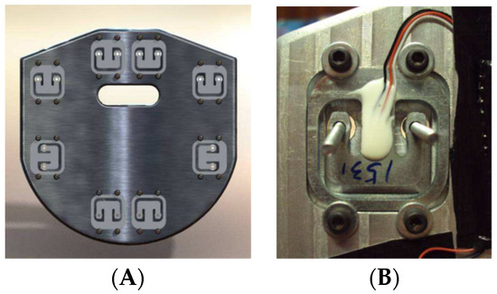 (A) View of the foot rest’s interior with four load cells on each side, (B) the detail of one load cell.