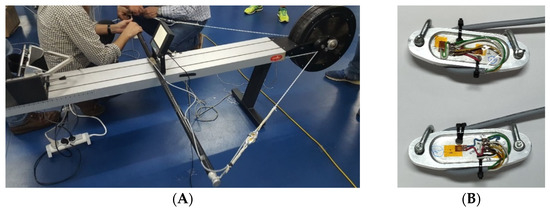(A) Kayak ergometer with instrumented foot rest and paddle ropes, (B) custom design load cells built for measuring kayak ergometer paddle ropes forces.