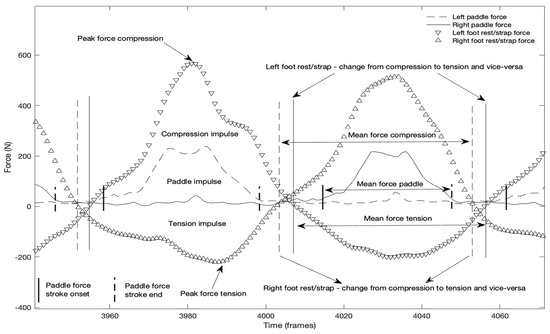 Time variables were also computed for each stroke: (1) the duration in time of the compression and tension forces, as well as paddle force application in each side; and (2) the time to peak force of the compression and tension forces applied to the foot rest/strap and on the paddle.