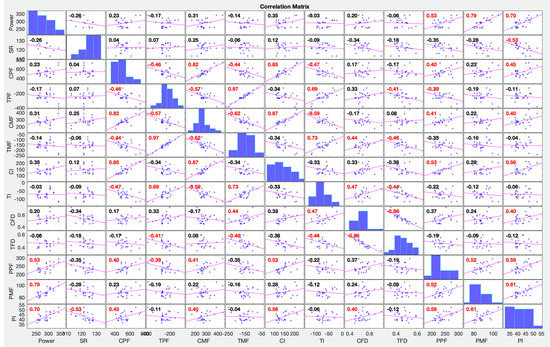 The correlation matrix with correlation coefficients between power and force variables of the paddle, foot rest and foot strap, combining left and right of 13 kayakers. Red correlation coefficients indicate strong correlation, the tendency line shows if its positive or negative. SR—stroke rate; CPF—compression peak force; TPF—tension peak force; CMF—compression mean force; TMF—Tension mean force; CI—compression impulse; TI—Tension impulse; CFD—compression force duration; TFD—tension force duration; PPF—paddle peak force; PMF—paddle mean force; PI—paddle impulse.