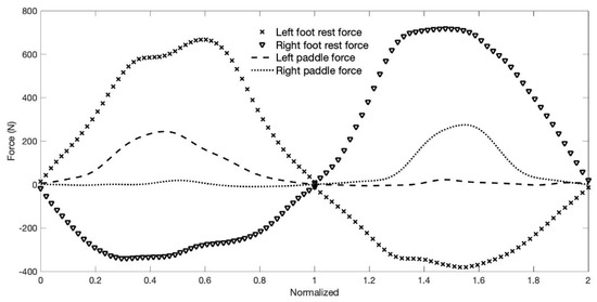 This study focused on the following forces developed by the kayaker: , paddle propulsion force; and foot rest forces, and . The interaction forces between kayaker and kayak in the Oxy plane are shown in Figure 2. The kayak seat receives the main weight of the kayaker, whereas the foot rest and foot strap receive the main forces developed by the kayaker legs/feet. The foot rest force applied by one foot, combined with the foot strap force applied by the other foot, creates a moment along the z-axis that makes it possible for the kayaker to rotate its pelvic girdle for paddling left and right and counterbalances the moment created by the paddle propulsion force, (Figure 2).